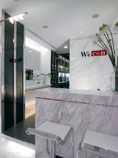 動線來到櫃台區,設計師因應原始管線因素順勢將地板架高,鋪設竹紋地板與接待區區隔,櫃台左側是原廁所用地現改為精美的廚具展示區,最特別的是此處地面以透明方式表現,保留原管道間的痕跡,作為傳承與改變的紀念意義。
