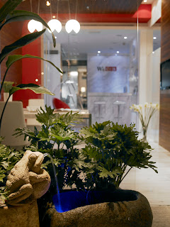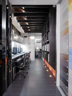 改造的過程繁瑣而講究,首先將原有外推的販售櫥窗移除,改為內縮的大片落地玻璃窗,窗前精心擺飾著綠意與動態的流水造景,在視覺美感中也不忘融入聚財活水的風水內涵。接下來將屋子中間切斷視野的廁所移除,巧妙突破狹巷的空間箝制,因此可以依序區隔出洽談區、櫃檯區、設計事務區與總監室,等四區前後緊密串連的必要機能,同時結合鏡面不鏽鋼、黑鏡等特定元素,將原建物多凹凸樑柱、管道間雜亂的缺失,經由線條切割的比例技巧,轉化為界定不同空間的象徵元素。完成後的空間令人驚艷,不僅消除了原有的幽暗、窒悶感,搭配多款經典燈飾、單品傢具以及手作擺飾的畫龍點睛,將這處櫥窗裡的辦公室,成功蛻變為聚集來往目光的街景藝術。