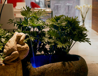 經過設計師巧思佈置的園藝空間,以蟾蜍的樸拙石雕搭配流水造景,不僅具有聚財活水的風水意涵,同時讓街景變得更綠意盎然。