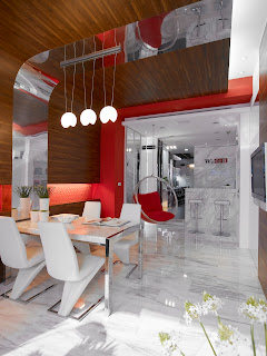 進入櫃台區前的鮮紅塊面同樣以L型延展,適時消化原有樑柱並完成空間分界。在此懸掛一座半圓、透明的造型吊椅取代制式沙發,因為在來訪的客群中,有時會有小孩隨行,而對專業設計師來說,同住的家庭成員每位都很重要,這樣的趣味吊椅不僅安全,也能滿足孩子們的好奇心,讓大人們可以放心且從容地交談,而且懸空的體態輕盈不佔空間,能延續動線的開闊感,甚至鮮紅的抱枕還能與主色系相輝映,真的是一舉數得。
