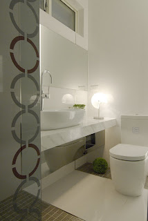 宛如精品飯店的洗手間,設計師將由上而下的直列燈溝取代傳統照明,不但能烘托衛浴牆面細緻的高亮釉質感,無形中也擴張空間。