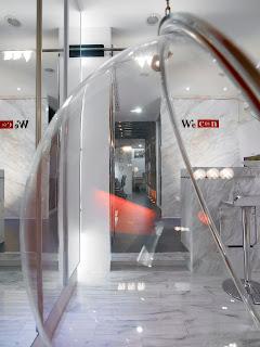 黑、白、紅是定義全空間與加強公司形象的三個主題色彩,因此在一進門的接待區,一色純白的地面與櫃台內外,使用明亮的銀狐大理石來展現質感,局部搭配純白玻璃與鏡面不鏽鋼、明鏡等反射材質重複使用,增加第一印象的明亮與通透感,而成L型包覆洽談區的集成材處理,則是豐富視覺層次,並在無彩度空間中增加溫馨感的巧妙手法。